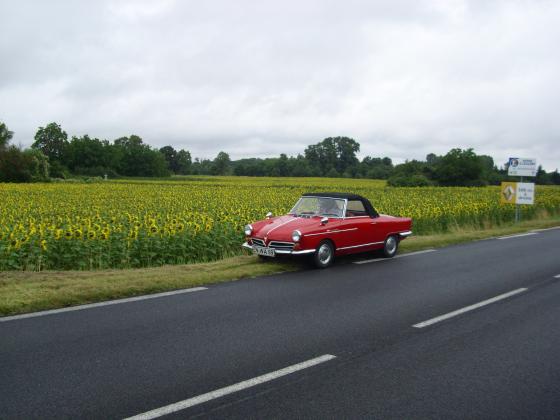 Monsieur Picard kommt auch herbeigeeilt und bestaunt interessiert unsere alten Autos. Wir erzählen von unserer Panne am Sonntag und HP fragt, ob es in der Landmaschinenwerkstatt einen Hydraulikschlauch für unseren Spider gibt, zur Reserve, man weiß ja nie, was kommt! Der älteste Bruder von Annick, Jean-Luc, wird herbeigeholt, ihn habe ich 44 Jahre nicht gesehen, so lerne ich ihn auch noch kennen. Als er aus der Werkstatt kommt, denke ich, es sei Annicks Vater, so sehr gleicht er ihm in meiner Erinnerung von 1964. Er besieht die Autos, den Schlauch, lässt sich alles erklären, verschwindet in der Werkstatt und kommt leider nach einer Weile heraus und schüttelt den Kopf, so einen Schlauch hat er nicht. Schade, jetzt müssen wir weiterhin die Daumen drücken, dass unser provisorischer Ölschlauch durchhält.